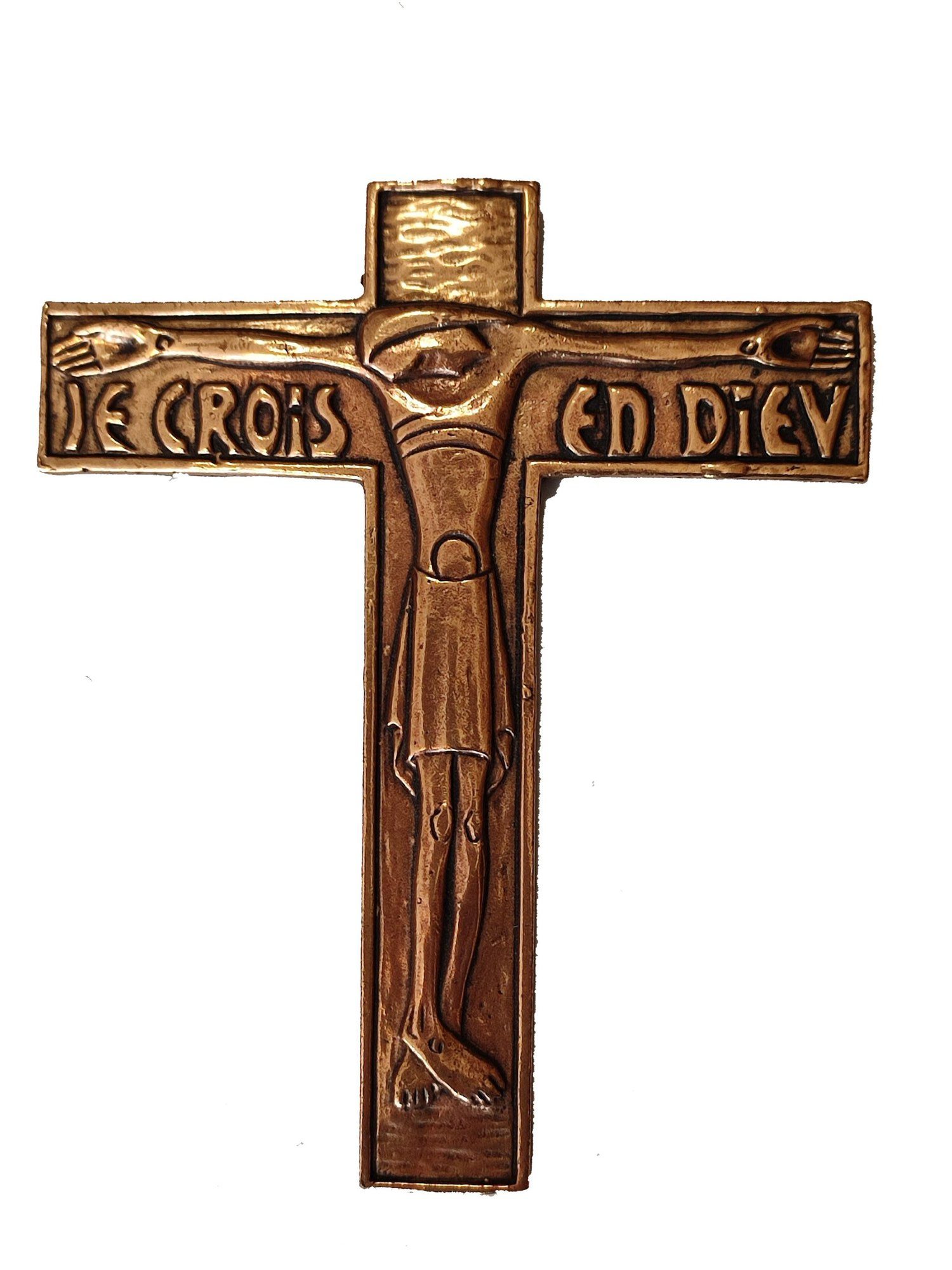 Croix en bronze avec Christ et l’inscription « Je croix en Dieu ».