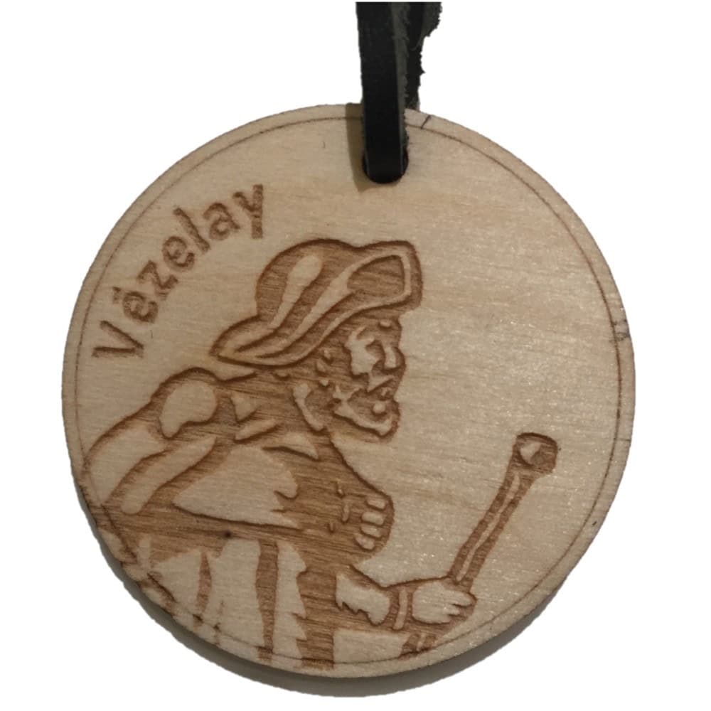 Porte-clé en bois pyrogravé recto-verso à l’effigie de Saint Jacques et de la coquille. Petite lanière de cuir.