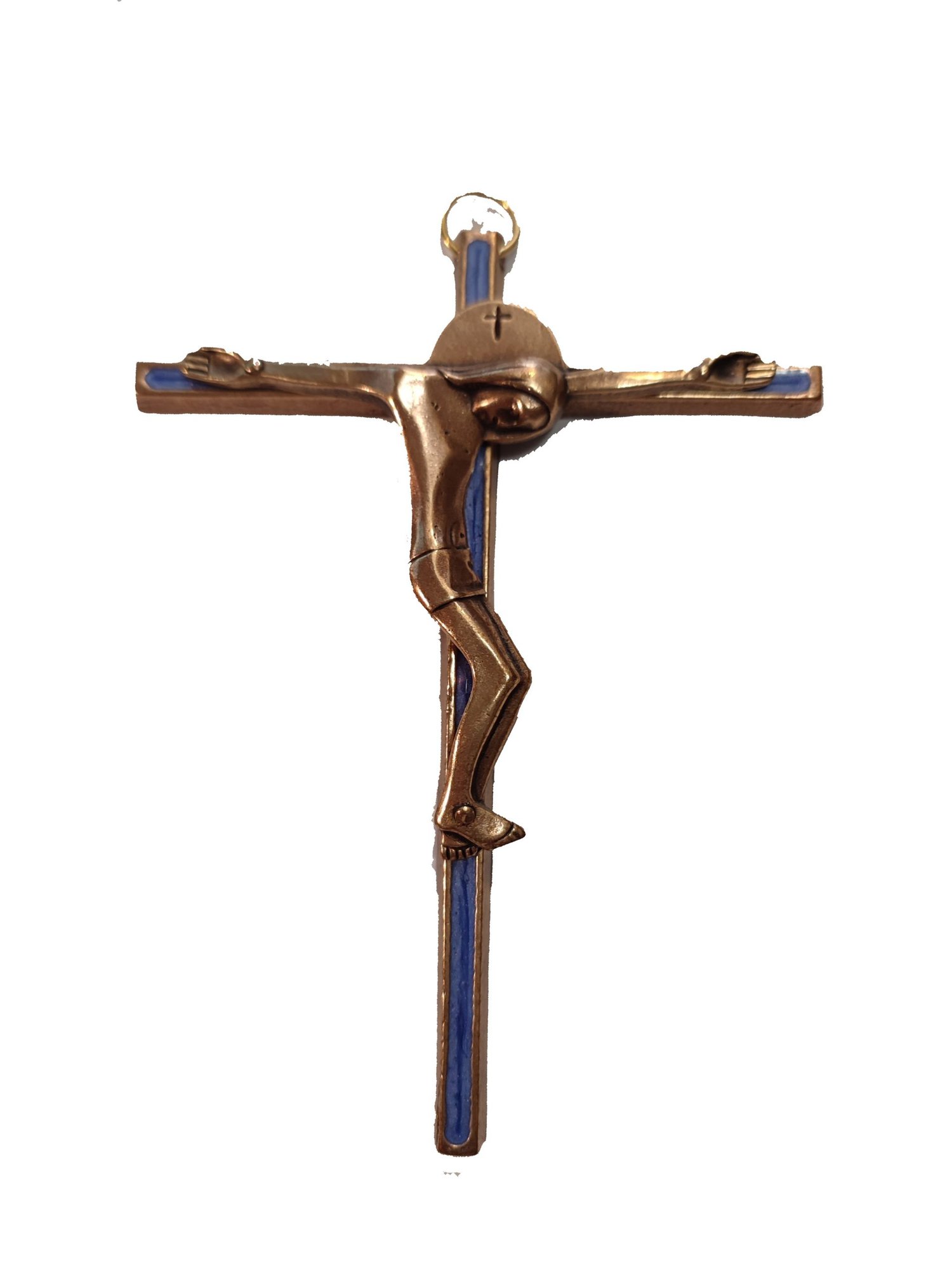 Croix bronze avec Christ endormi, émail bleu – Sodarec