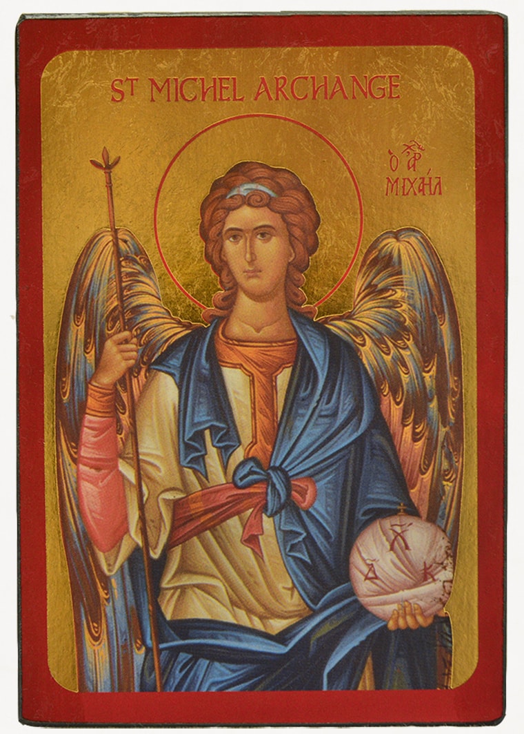 Toute la force de Saint Michel archange est nettement suggérée par cette icône chargée de symboles. Modèle byzantin traditionnel. Les couleurs vives de cette icône resplendissent au milieu de l’or