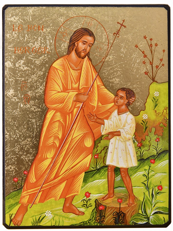 140.14 Icône le bon berger conduisant un petit garçon (8 x 11 cm )