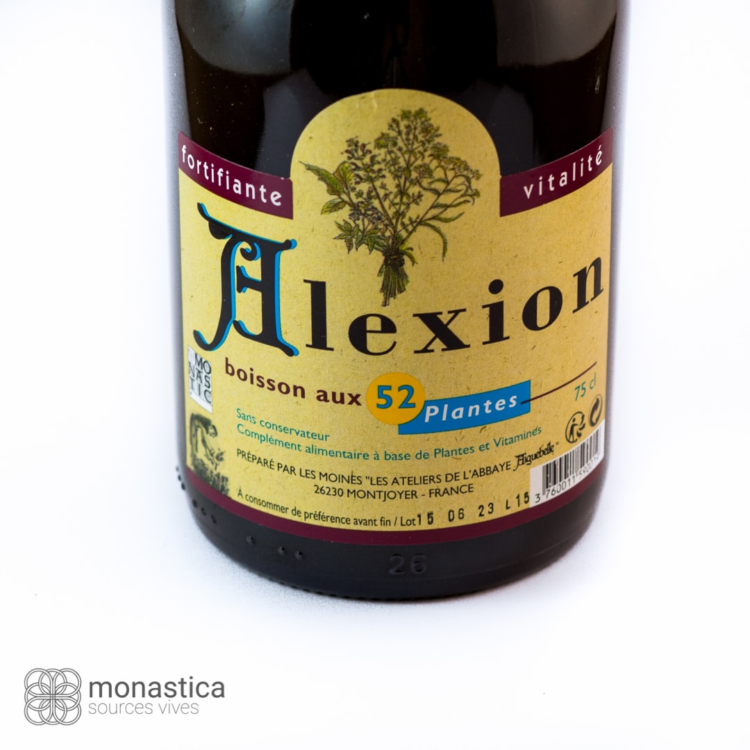 L’Alexion est une boisson tonifiante à base de 52 plantes sélectionnées et préparées par les moines de l’Abbaye Notre Dame d’Aiguebelle (Montjoyer). Riche en vitamines et en sels minéraux, elle a des propriétés stimulantes et reconstituantes. Spécialement recommandée dans les moments de fatigue ou de récupération, la boisson Alexion permet aussi de soutenir un surcroît d’effort. Parfaitement adaptée à toute la famille, cette boisson, entièrement naturelle, peut être servie très fraîche comme apéritif. Boisson aux 52 plantes. Ingrédients : eau, fructose, infusions et extraits de 52 plantes (ginseng : 0,063%). Vitamines, colorant : caramel. Sans alcool, sans conservateur. 75 cl.