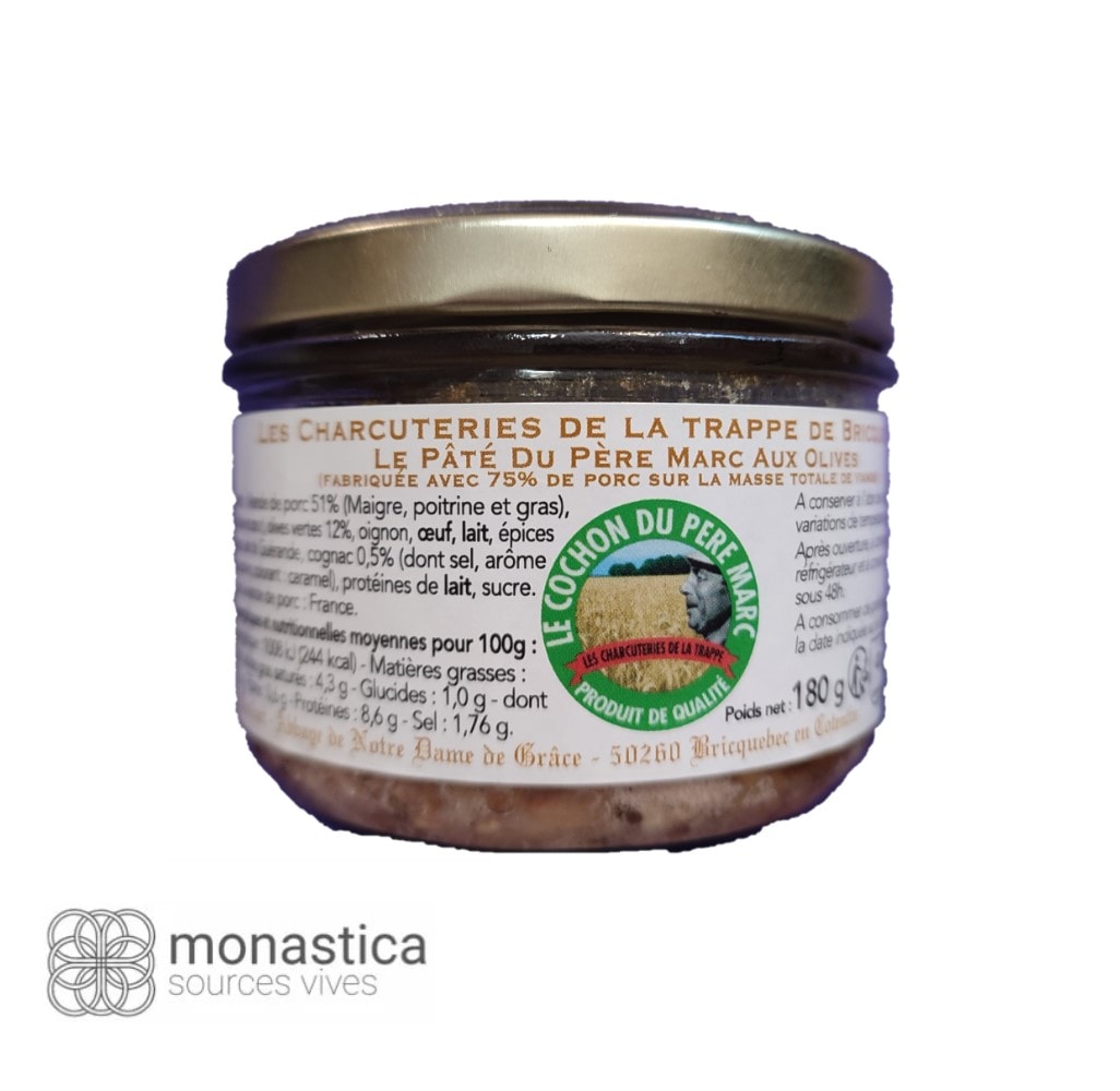 La Pâté du du Père Marc aux olives provenant de « Charcuteries de la Trappe » de l’Abbaye Notre Dame de Grâce de Bricquebec (Normandie) fait partie d’une très bonne gamme des pâtés que produit leur laboratoire.