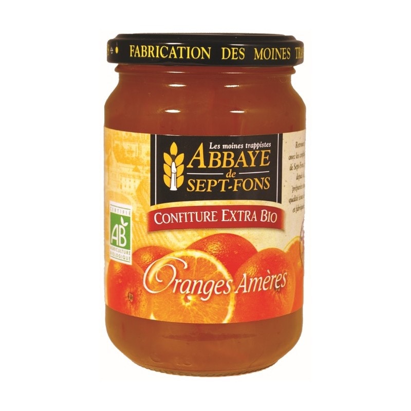 La confiture extra de ORANGES AMERES BIO des moines trappistes de Sept-Fons a été préparée avec 50g de fruits pour 100g de confiture.