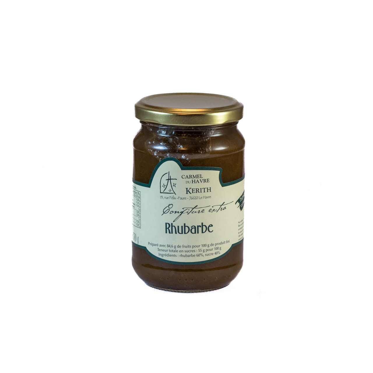 La confiture de rhubarbe du Carmel de la Transfiguration (Le Havre) fait partie d’une gamme de confitures et de gelées plus légères en sucre. Elles sont cuites au chaudron par petite quantité et sont fabriquées à partir d’un sirop de sucre à la perle dans lequel sont jetés les fruits fraîchement récoltés. Tout le secret de cette fabrication réside dans le degré de cuisson du sirop de sucre, adapté à chaque fruit et à chaque saison. Cette technique artisanale permet une cuisson rapide du fruit qui lui conserve toutes ses vitamines et sa saveur.
