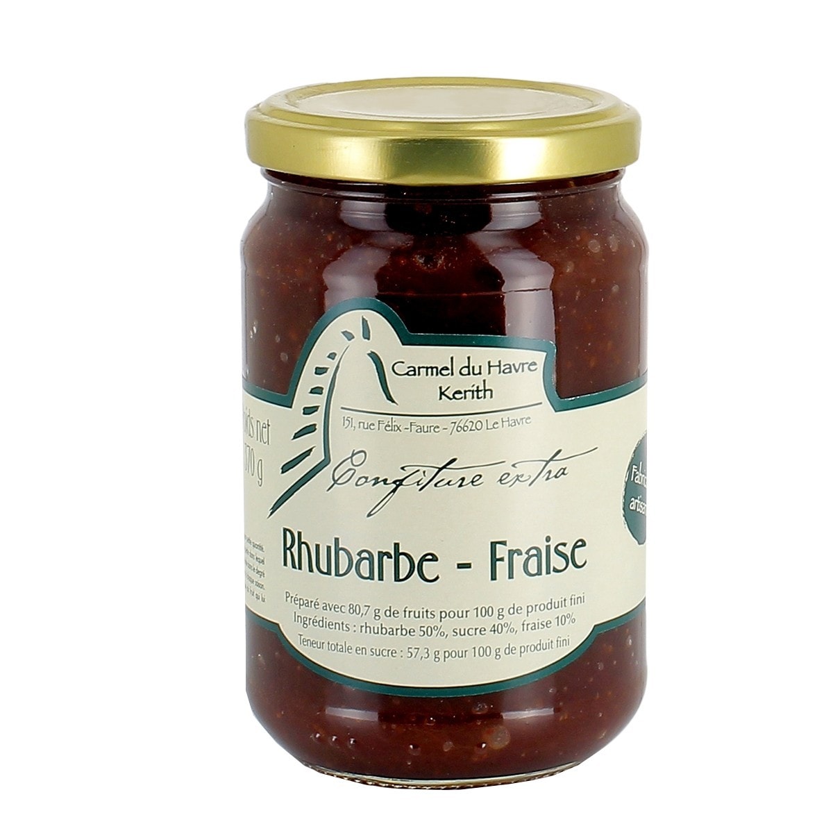 La confiture de rhubarbe-fraise du Carmel de la Transfiguration (Le Havre) fait partie d’une gamme de confitures et de gelées plus légères en sucre. Elles sont cuites au chaudron par petite quantité et sont fabriquées à partir d’un sirop de sucre à la perle dans lequel sont jetés les fruits fraîchement récoltés. Tout le secret de cette fabrication réside dans le degré de cuisson du sirop de sucre, adapté à chaque fruit et à chaque saison. Cette technique artisanale permet une cuisson rapide du fruit qui lui conserve toutes ses vitamines et sa saveur.