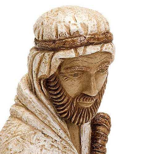 Il existe deux possibilités de Saint Joseph: ici se trouve Joseph debout avec son bâton de pèlerin et de berger de la Sainte Famille, dans une représentation traditionnelle. Le vêtement est marron tandis que le couvre-chef est blanc comme sur la photo autour de l’Enfant Jésus.
